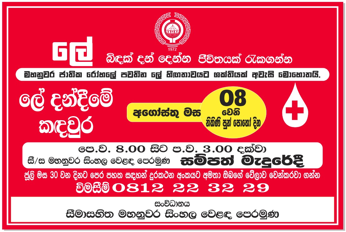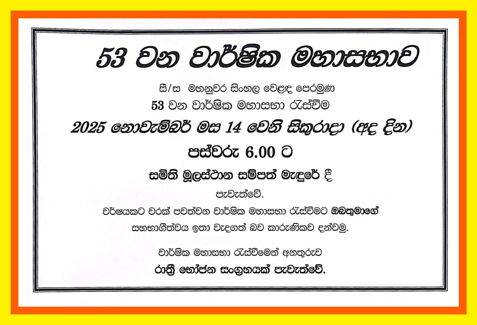 Sampath Hall Sangaraja Mawatha, Kandyමහනුවර සිංහල වෙළඳ පෙරමුණ53 වන වාර්ෂික මහසභා රැස්වීම 2025 නොවැම්බර් මස 14 වන සිකුරාදා (අද දිනය)පස්වරු 6.00 ට සමිති මූලස්ථානය සැමිබත් මැදුරේදීපැවැත්වේ.